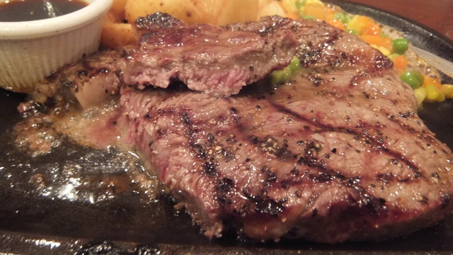 暫くすると、「ジュージュー」音を立てて、ステーキが登場。油が飛び跳ねるのも、食欲をそそる。ミディアム。本当は、レアが、好きなのだが、お店に寄っては、安全性の問題もあるので、ミディアムにしている。こちらは、問題ない。