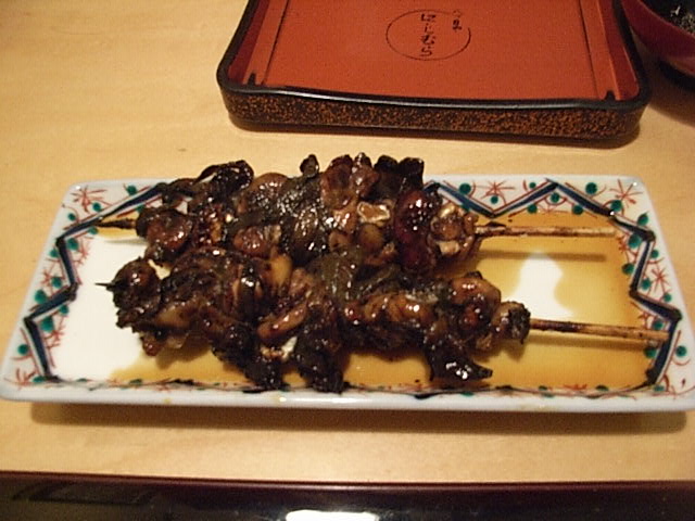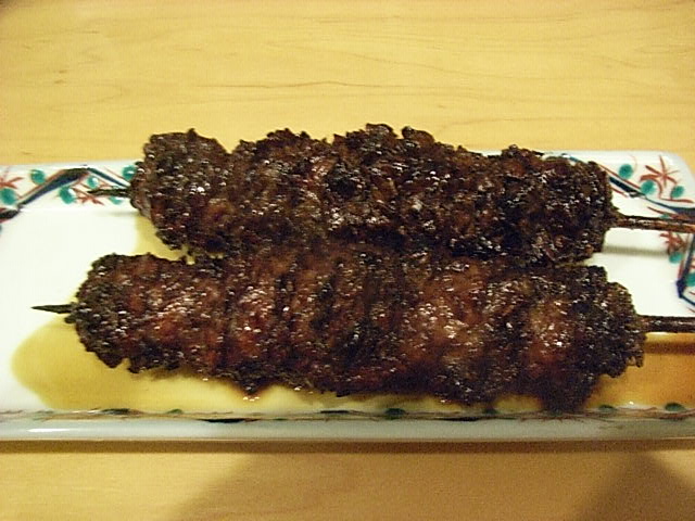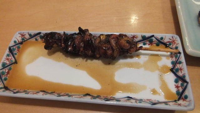 寒い日だったので、「特撰菊正宗」の熱燗、650円をいただいた。「肝焼き」は、売り切れとの事なので、メニューには、載らなくなった「八つ目鰻」の「もつ焼き」は、無くなったのと尋ねたところ、「ありますよ」との答えだったので、2本600円でいただいた。「肝焼き」よりは、200円安い。