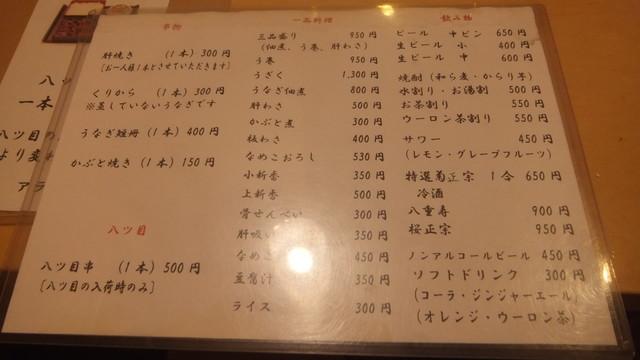 店頭のメニューから「八つ目鰻」や「もつ焼き」の表示が消えたので、お店の方に「上で、八つ目、食べられますか」と尋ねたところ、「食べられますよ」との答えだったので、案内された2階の窓際カウンター席で、一人いただいた。
