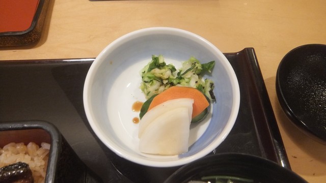 「八つ目重定食」の小を注文したところ、「今日は、中以上しかありません」との答えだったので、300円高い2700円の中にする。肝吸い、お新香付き。