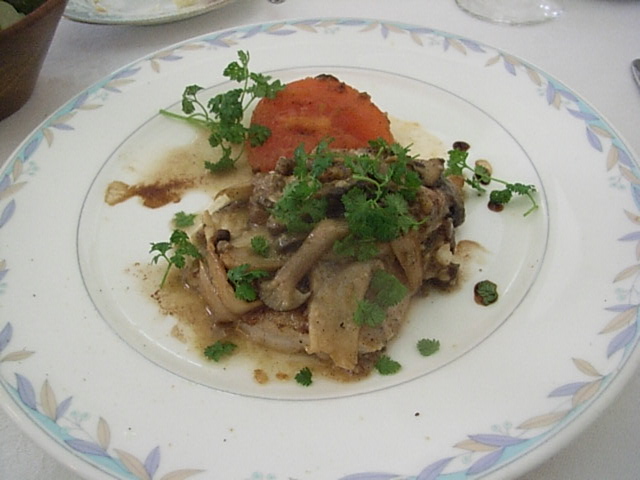 「オニオングラタンスープ」にメインが、「真鯛のムニエル、きのこソース添え」、それに野菜サラダ、パン、バター、デミタスコーヒーのコース。美味しい。