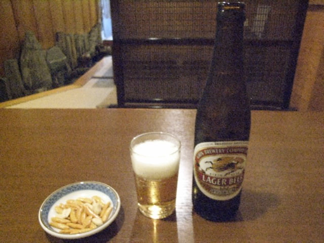 上がり座敷で、「キリンビール・小瓶」500円を飲みながら、待つ。おつまみに「柿ピー」が出る。