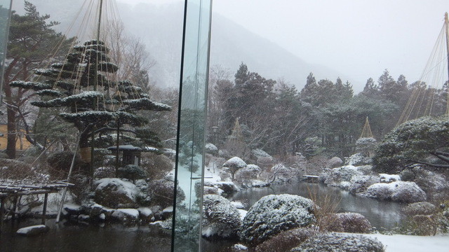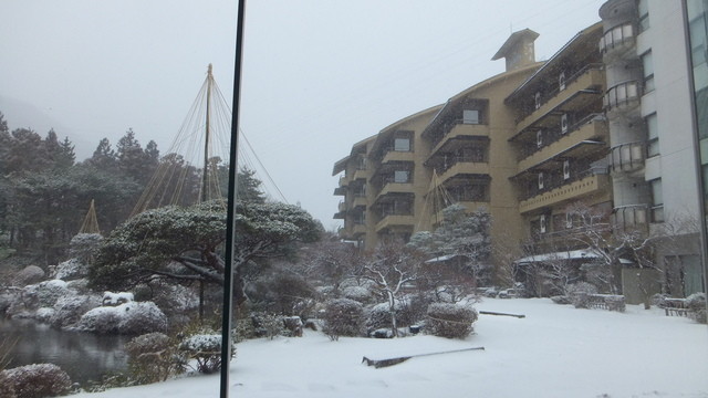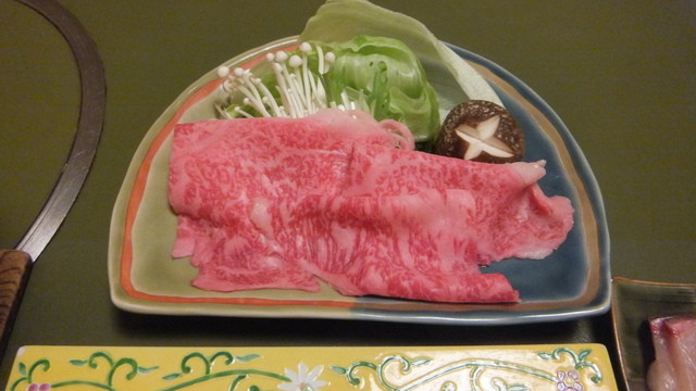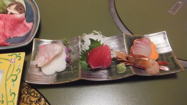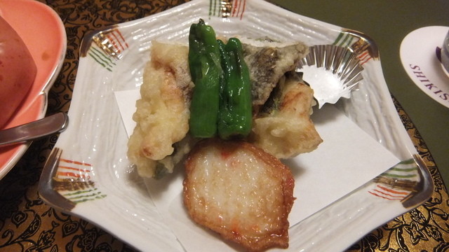 福島県磐梯熱海の旅館「四季彩一力」の夕食。部屋出しと夕食処が、選べるのだが、私は、夕食処を選択。高級旅館の場合、部屋出しで懐石料理の一品出しが、ステータスのような時代があったが、私は、食後、とっとと横になりたいので、食事処での食事の方が好きだ。それに貧乏性で、比較的、食べるのが早い。その為に、全部、一度に出されるほうが良い。というわけで、食事処の個室で、一人、黙々と夕食をいただいた。別注文の一合1617円の日本酒「飛露喜(ひろき)」と食前酒をいただく。メニューは、10品。食べる順番は、ばらばらになるが、前菜は、蟹みぞれ和え、熨斗鶏松葉刺し、合鴨土佐酢煮、蓮根煎餅、公魚しんびき粉揚げ、蛸の柔か煮、海老芝煮、河豚皮煮凝りが、一皿に盛られて出てきた。綺麗な盛り付けで、上品な味だ。造里は、お造り盛り合わせ妻色々、鍋物は、福島牛しゃぶしゃぶ野菜色々。良い感じの肉をしゃぶしゃぶといただく。