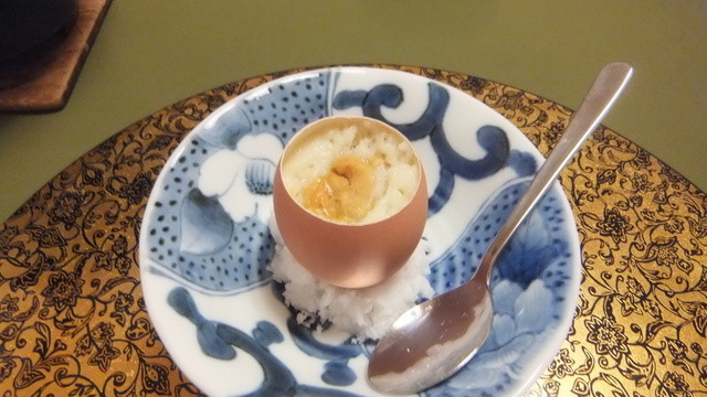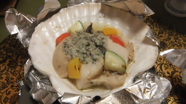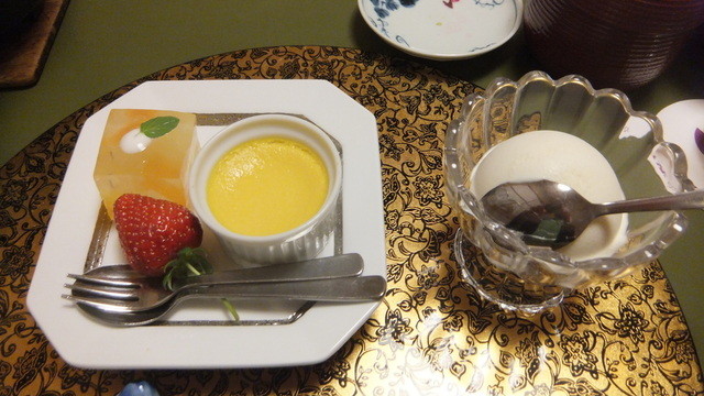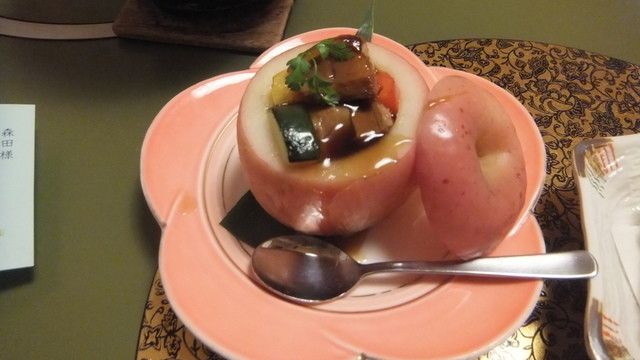 順序が、逆になったが、先付は、「ぽんかん釜盛り」。蓋をとって写真を撮るのを忘れた。焼物は、「帆立のブルギニヨンバター焼き」。大きい帆立がボリュームたっぷり。私は、帆立が、大好き。さらに「JTBのお客様限定」の「養老玉子」。進肴の「えごま豚の角煮、りんご釜盛り」、揚物「鰈のアスパラ巻き、薩摩揚げ」と続く。焼物から後は、先に一緒に出すのではなく、後から、順に運んでくださった。そして食事が「郡山産あさか舞コシヒカリ、香物盛り合わせ」、留椀が「赤だし」。いずれも、美味しいが、御飯がとりわけ、美味しい。最後が水菓子「南瓜プリン、苺フルーツゼリー寄せにアイスクリーム」。盛りだくさんで、美味しい夕食だった。満足。