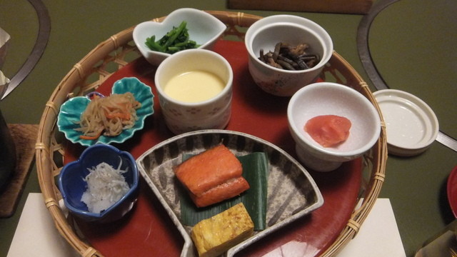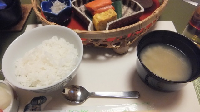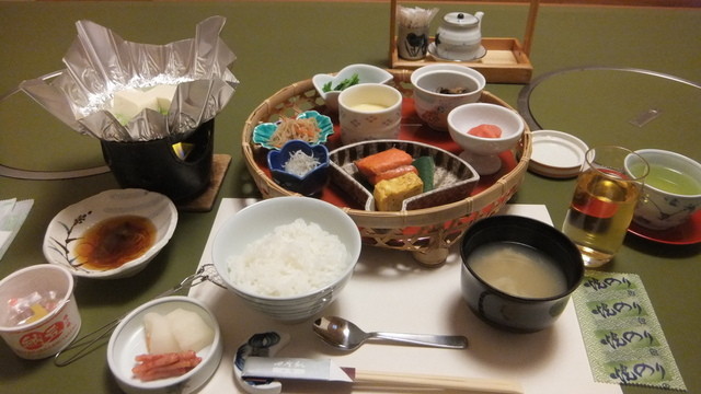 福島県磐梯熱海の旅館「四季彩一力」2日目の朝食は、夕食と同じお食事処の個室。ソフトドリンク、サラダ、海苔、玉子などは、セルフサービスで、食べ放題。それ以外は、朝から湯豆腐付きという自宅の朝食では、考えられない、色とりどりの朝食。朝から、食べ過ぎては、いけないと腹八分目で我慢した。満足した、「四季彩一力」のお食事だった。