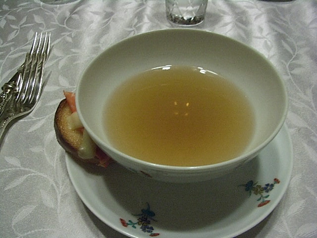 次が、蟹のコンソメスープとクルトンと蟹。混ぜるとスープが濁るので、別に、召し上がれとのこと。これも、上品で美味しい。