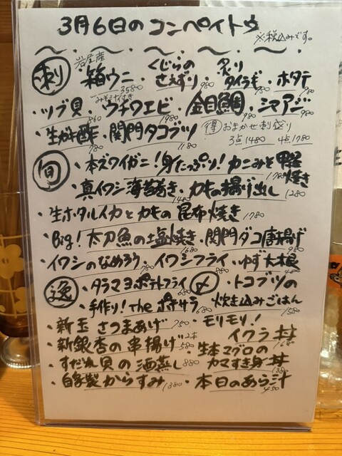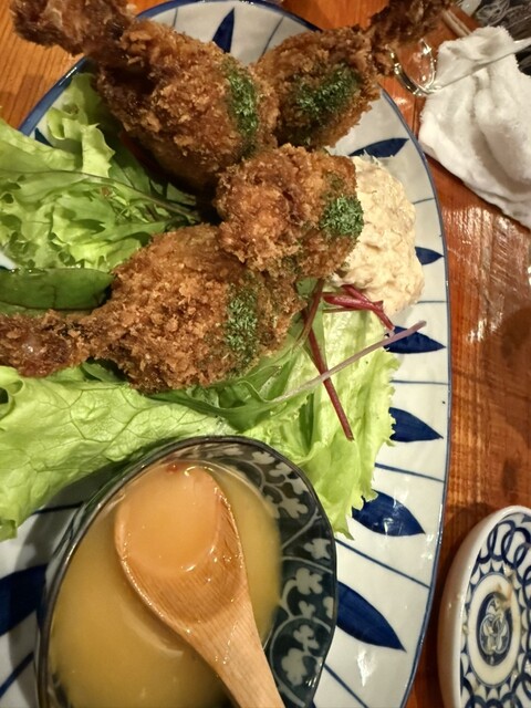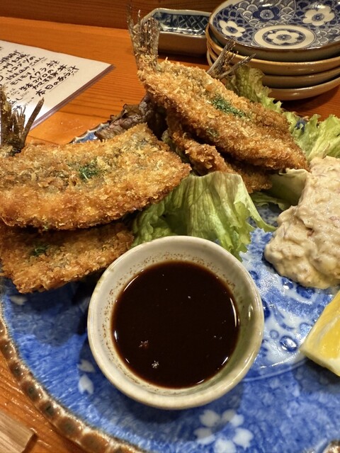 イワシフライ、生ホタルイカとカキの昆布焼き、Big!太刀魚の塩焼き