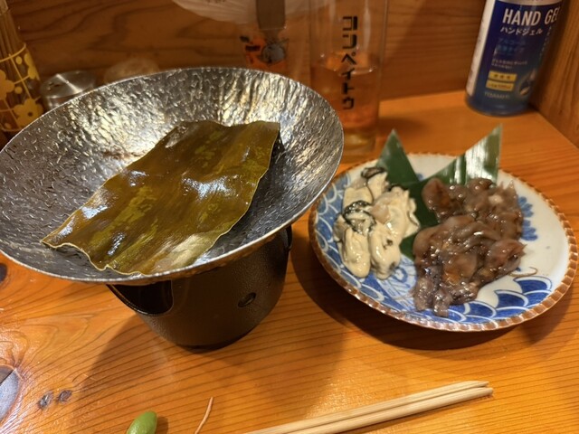 いかにもうまそうなホタルイカとカキが昆布の上で焼かれて、