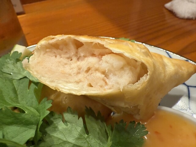 エビのむき身を春巻きにしたものをアジアンテイストでいただきます