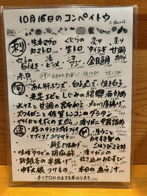 新サンマフライ、ヤリイカとモズク天ぷら、銀杏、カマ剝き身、焼き白子など