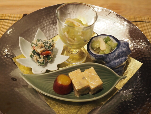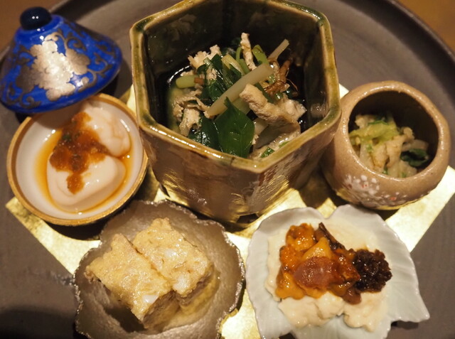 付出は中列左から牛すきの玉〆に甘海老の酒盗和え、葉ごぼうの胡麻和えが並び、
