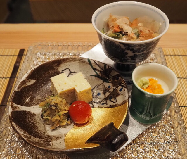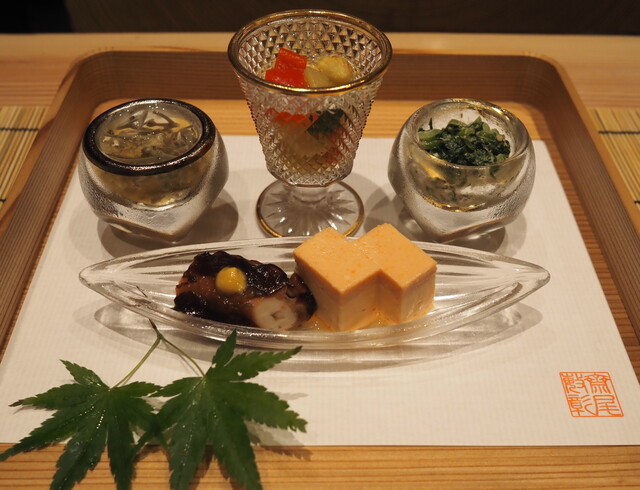 付き出しは左に蟹の玉〆と子持ち昆布、手前に生湯葉になめこ餡、