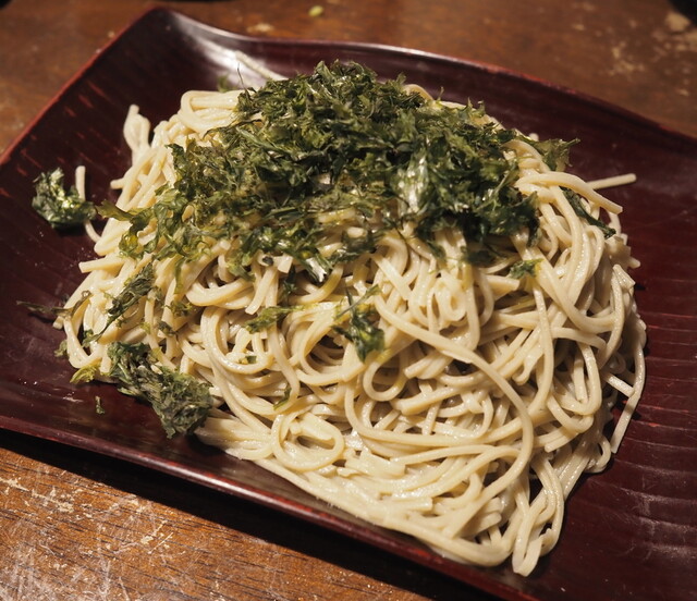 海苔で巻いたクリームチーズを挟み、〆には冷たい明日葉そばと温かいつみれ汁を。
