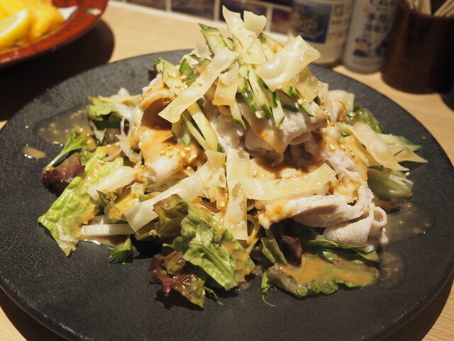 見慣れないメニューの中からきなこ豚の冷しゃぶサラダと鮎の塩焼きをチョイス。
