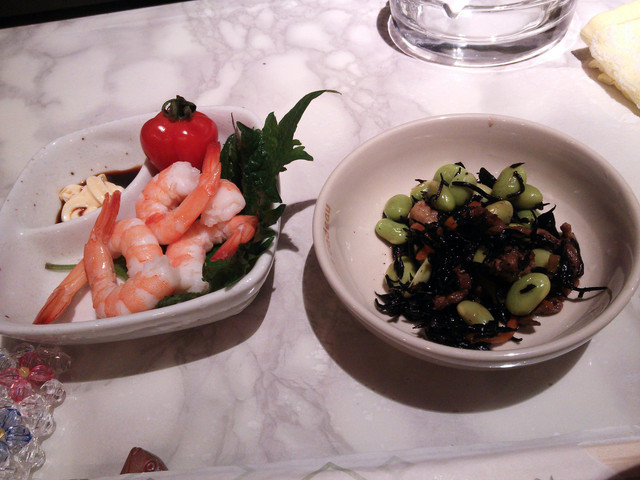 お通し2品♪ ひじきの煮物と海老さんでした!