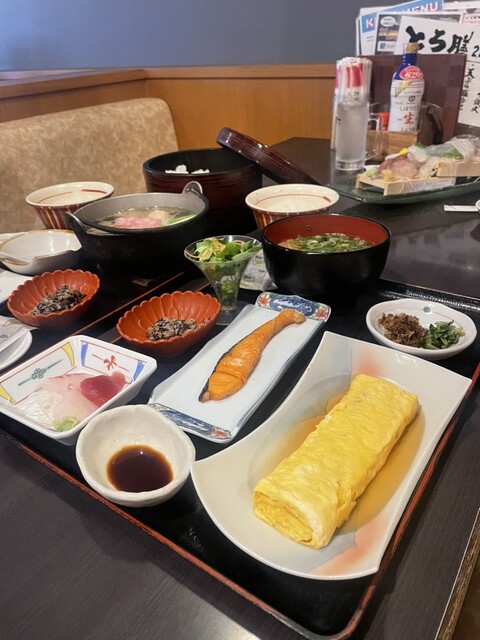 出汁巻き、お造り、中鉢、味噌汁、香の物、焼鮭、サラダ、ご飯、味付け海苔