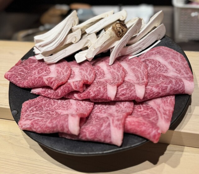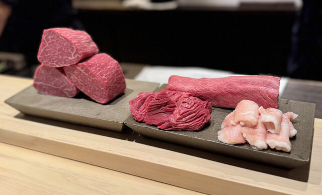 カウンター席のみ但馬玄などの稀少な銘柄ブランド牛を食べられ、コース料理の一斉スタートです。