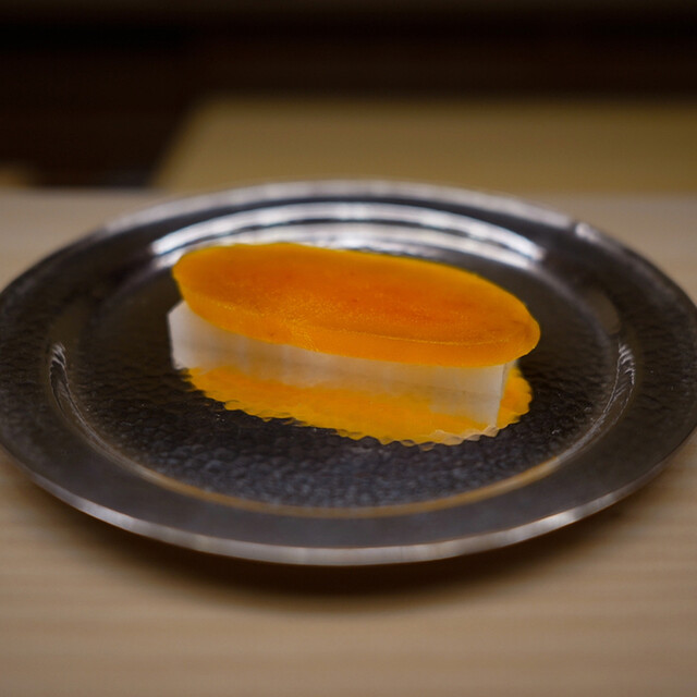 口直しに水とほんの少しの塩しか使っていないのに本当に美味しい氷見の在来種、朝どれの大根を炊いたものを挟むのですが、これがまた抜群に美味しい。