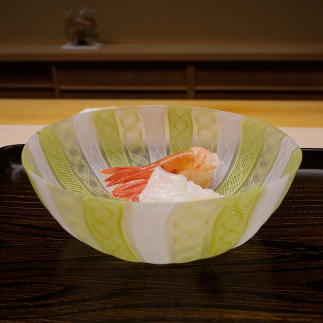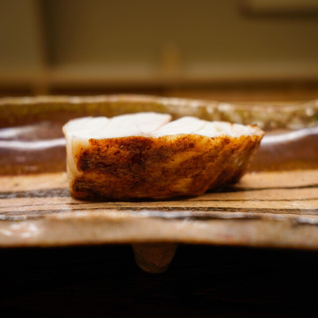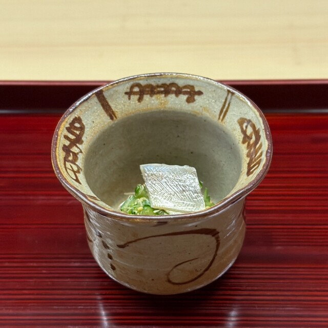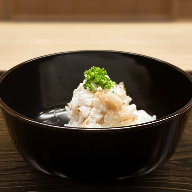 スタートはマフグ白子のお粥。トラフグの季節は終わりましたが、マフグなりの良さを引き出し、一気に凛とした片折さんの世界に引き込んでくれます。