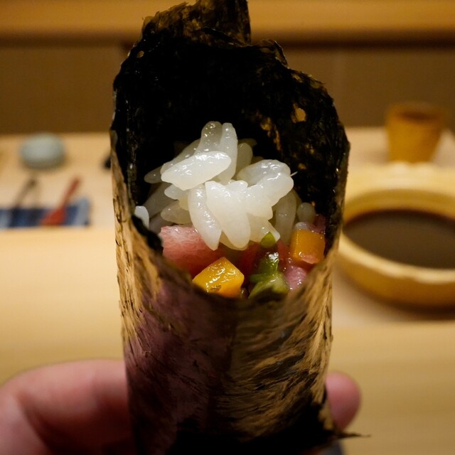 明石のタイのツマミから握り、玉子焼きまで、全て高い志と技術があった上での独自のチャレンジが詰まっていて、最初から最後まで楽しく感心させられるものでした。
