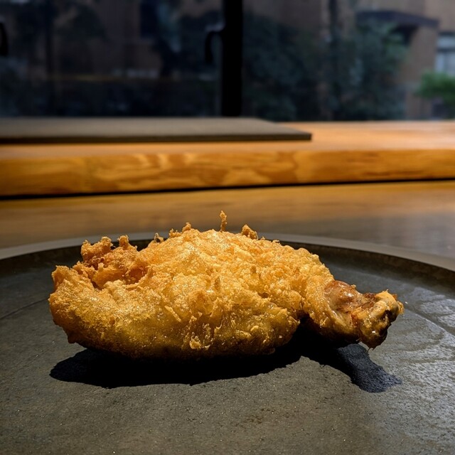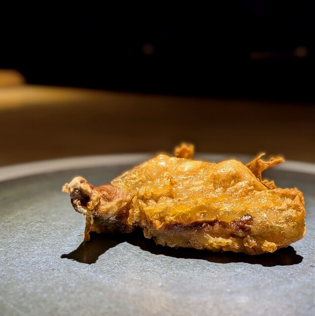 鳩の良い臭みとしっとりした食感をカリカリで濃い味わいの衣に閉じ込める。