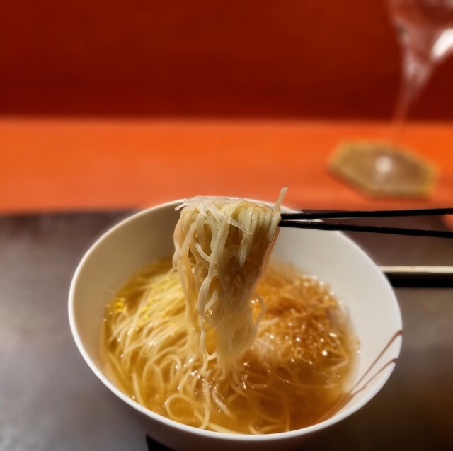 上海蟹の旨みとお野菜の甘みが良く出たとろみのあるスープに極細縮れ麺がからみ、最高。