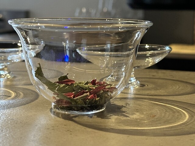 ドリンク③ ・まず、グラスの底に、韓国唐辛子で作った果肉入りシロップを忍ばせてから ・青みかん果汁を、一保堂の煎り番茶で割ったものを注いで