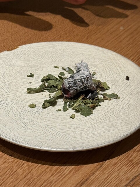 ・富山から子持ち甘海老 (適宜霧吹きしながらじっくりと薪焼きに) ・塩漬けで2ヶ月熟成した甘海老の卵 ・クリーム ・レモンバーム、レモングラス