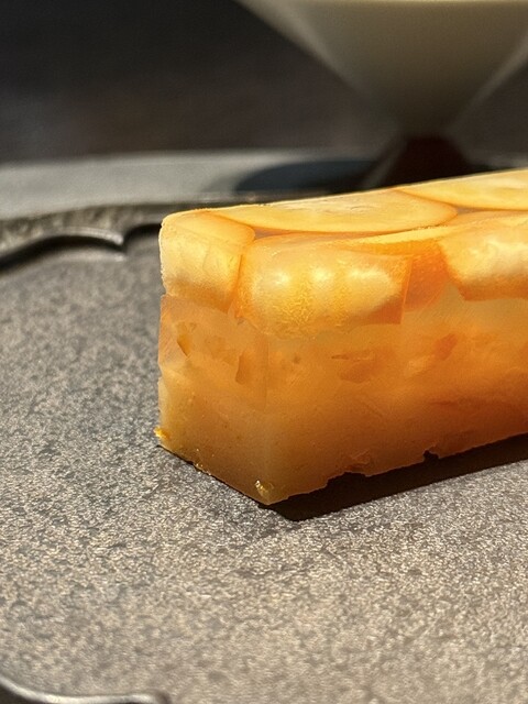 金柑ライムと白樺樹液ゼリーはジューシーさと明るい酸味で、力強い餡とバランスをとる。