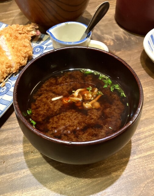 赤だしの味噌汁は器もほっこりしてグッドです。