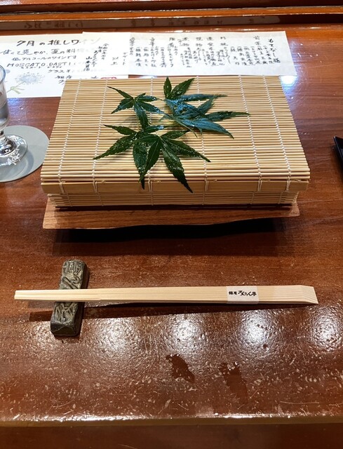 青竹筒に入った海老、鮑、南京がジュレにまみれて涼し気の中に旨味が凝縮。
