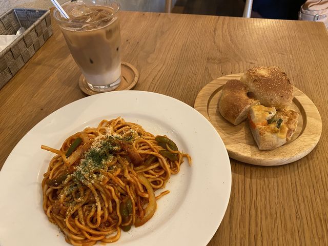 メインパスタ、パン、ドリンク、デザート、お持ち帰りパン(300円分)と、