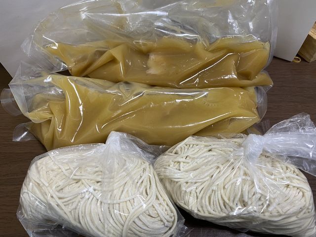 お持ち帰りは、スープ、麺が別々に真空パックされています。