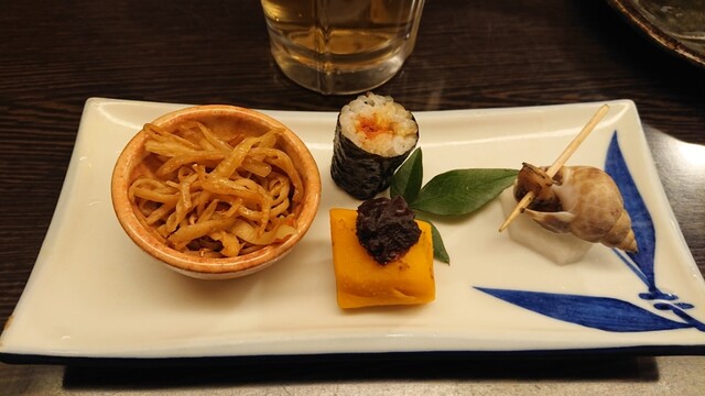 ツブ貝、カジキ、スミイカ、平目、春ガツオ、カワハギの肝のせ、平政、生ミンク鯨にイワシ鯨の九品盛り、さすが大ばん