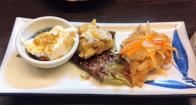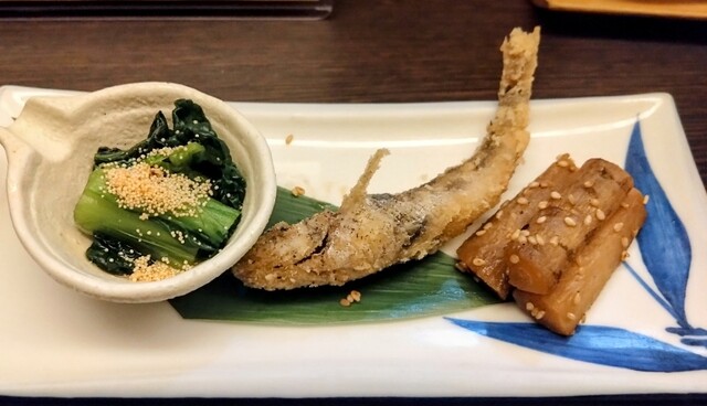 お通し三種盛り(縮み雪菜のお浸し〜タラコのせ、メヒカリの唐揚げ、ゴボウの胡麻和え)