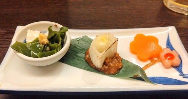 お通し3点盛り(メカブと豆腐、ネギ肉味噌のせ、人参の裏漉し)
