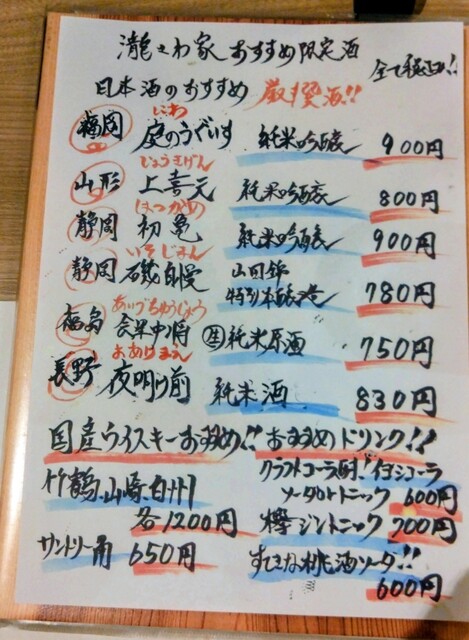 2杯目からは、瀧さわ家おすすめ限定酒のメニュー表を上段から一杯づつ