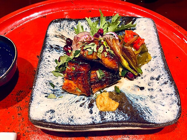 ◎ 岡山県産の天然鰻は地焼きです。見事な朝鮮唐津の皿ですね。知らんケド。