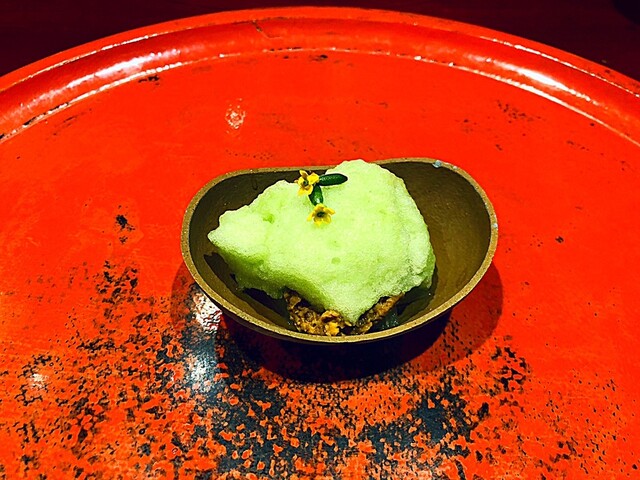 ✽ 水菓子… 酒粕のシャーベットに野人参という葉(人参ではない)を乗せて、上賀茂で採れた苺、シャーベットに下は文旦と文旦のマーマレード。