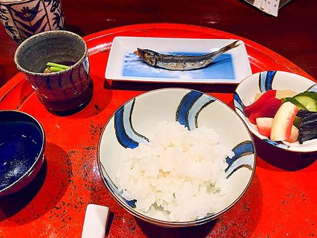 ◎ パリパリに焼いた鮎と田中唐辛子(京野菜で種が少なく辛味もない)。鮎はこれくらい焼いた方が頭からボリボリいけて美味しかったです。蓼酢も本当はこんな味なんでしょうね。薬草みたいです。