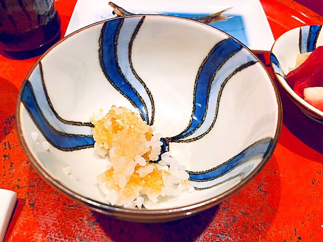 ◎ 定番の井戸水で3ヶ月育てた鯉の洗い。左の種がみえる緑のもはマイクロ胡瓜の成れの果て。そう言うものも慈しみを持って頂くのがなかひがしスタイルです。全部を混ぜて頂きます。