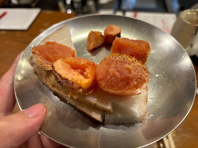 4日前に焼いて熟成。表面のかりかりの焼き具合と中のプルプルの食感が綺麗に織り混ざった絶品の皮。焦げ目がつくほどの焼き加減で、香ばしい炭な香りと食感を感じさせつつ、中はしっかりと皮の食感の良さを感じる。今まで食べた中でも最上位クラスの皮。感動。