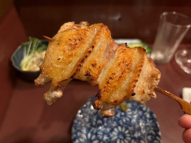 鳥は火が当たってる皮部分のみパリパリ、それ以外は柔らかいプルプルの皮に包まれたでかいモモ。上に添えられた柚子胡椒の風味と味わいも最高。