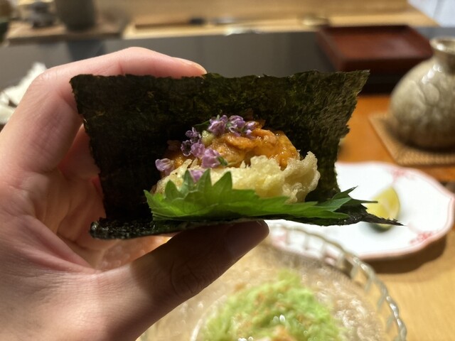 人生初の天ぷらフルコース。大満足のコースでした。天ぷらの衣が、自分史上過去一の衣で、別にしなっているわけではない、見た目はサクサクしてそうな食感を連想させる衣。薄いわけでもなく、しっかりと衣がついている。しかしなぜだ、口の中に含むと衣が『とける』という表現が一番近いかもしれない。衣の感じがほとんどせず、食材の旨みを、それぞれの調味料、食べ方、最上級の活かし方で口の中に入る。しかしいくら衣が感じられないといっても、これなんですかと聞かれると、揚げ物、天ぷらだ、となる不思議な感覚。これが最高級の天ぷらか。内容も豪華。旬のものが全て。鰆、河豚、松茸などの季節ものに加え、雲丹、帆立、金目鯛などの上級食材。同じく上質な酒や、季節ものの酒と合わせて。美味しくないはずがないですね。
