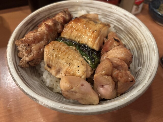 5分ほどでどちらも到着。ラーメンは焼き鳥屋さんということで鳥のラーメンを期待して注文したがシンプルな醤油ラーメン。焼き鳥定食にすればよかったと後悔の念もあるが、はっきりとした味がある町中華の醤油ラーメンとしても美味しいほう。メインの焼き鳥丼。もも、つくね、ねぎま。焼き鳥のタレが照り焼き風な味わいで、見た目よりもしっかりと米にも鶏肉にも味が付いているのがとても良い。鶏肉ももちろん美味しいが、特にタレとの相性が良かったのがネギ。外側は先述の照り焼きのような甘みがコーティングされた上、中身はもう1段階コイタレが十分に染み込んでおり口に含んで旨い、噛んでさらに旨い、余韻まで美味しい。またこのねぎまが面白い。間というより鳥inネギ。ネギを鳥の身がネギを覆っているような串うち。初めて見た造形と新たな食感に邂逅できた。