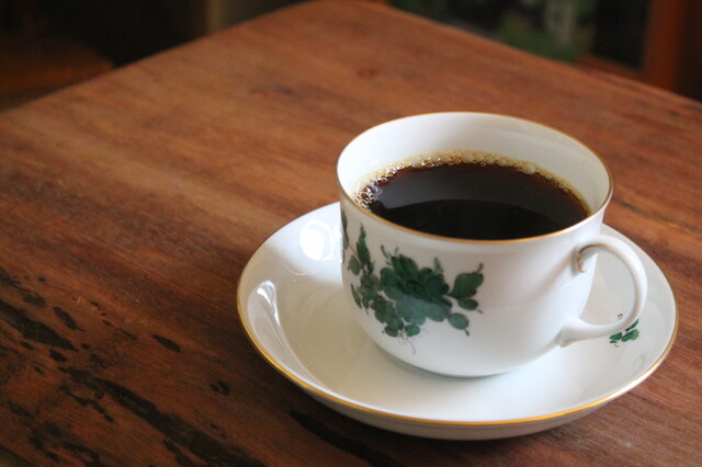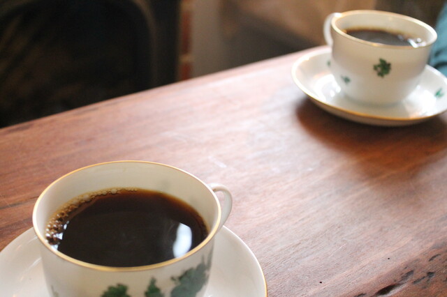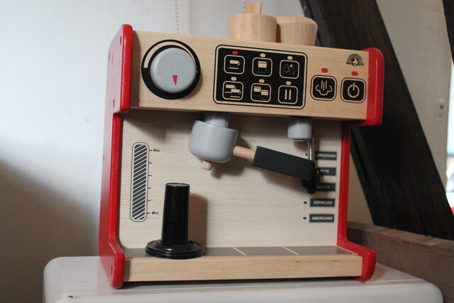 子供のおもちゃの木製ミニミニエスプレッソマシンが可愛いなぁとまじまじ眺めているところに珈琲が到着。