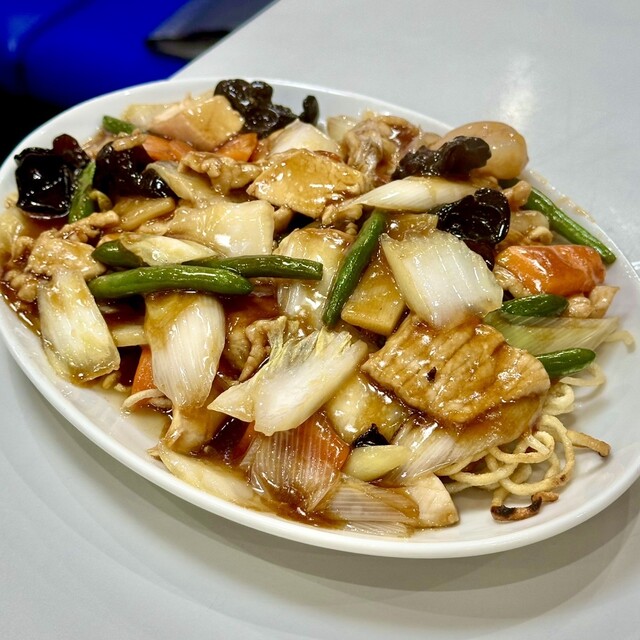 名物料理は豚・鶏・海老のあんかけをのせた