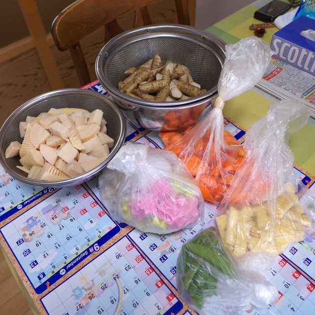 ごぼう、蓮根、里芋、筍、大根、人参、大豆、絹さや…