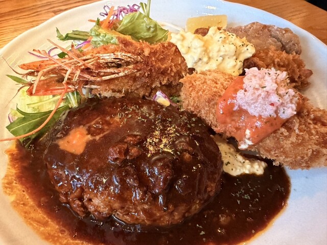 肉感満点のハンバーグは、食べ応えバッチリ。海老フライもサクサクの衣とプリプリの身が良い感じ。唐揚げは大ぶりなのに、味はしっかり。グラタンコロッケは、この時期、某ハンバーガーチェーンのおかげで食べたくなるヤツ。ぶっちゃけ、こちらのお店のほうが圧倒的に美味しいです。