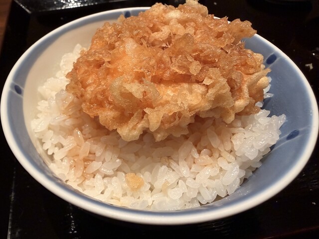締めはかき揚げ。ご飯にのせて天丼にしていただき、味噌汁とともに堪能。お腹いっぱいなのに、ペロリと食べられるのは不思議です。